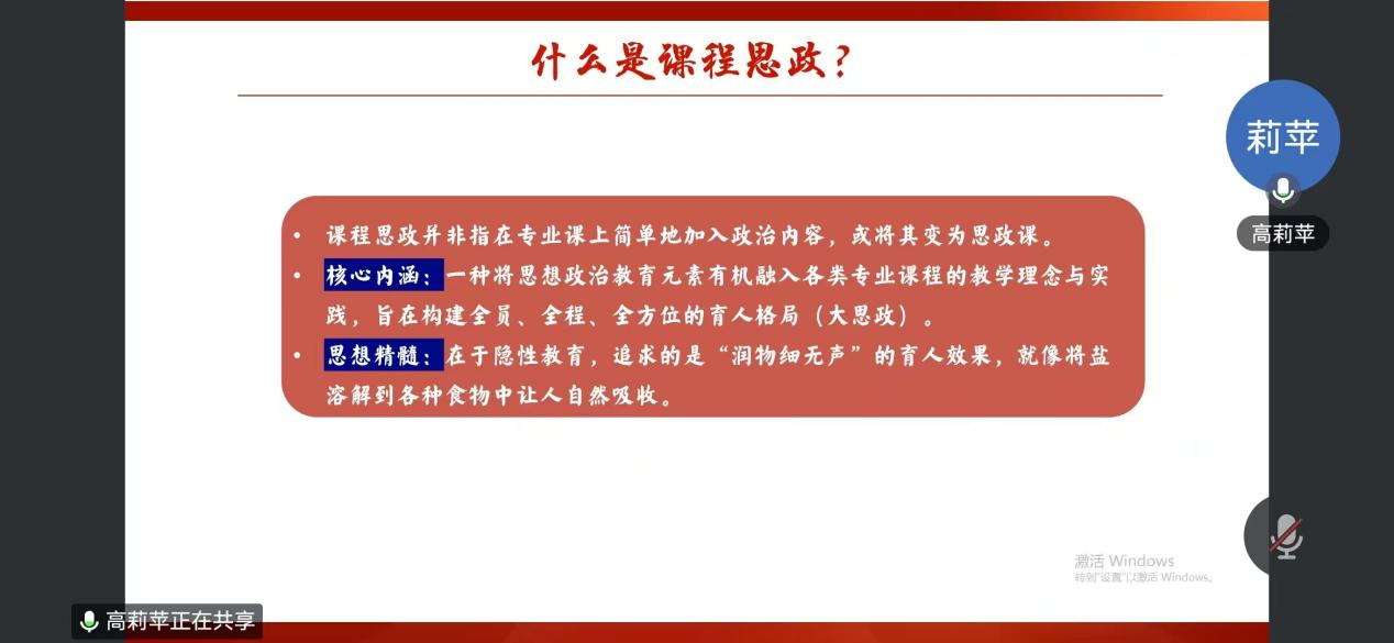为深入贯彻落实习近平总书记关于教育的重要论述及全国高校思想政治工作会议精神,全面推进课程思政建设与专业教育深度融合,切实提升教师课程思政育人能力,2025年11月3日,必赢76net线路官网组织全体教师开展课程思政专题线上座谈交流会。本次会议特别邀请马克思主义学院高莉苹副教授担任主讲嘉宾,围绕课程思政建设的核心命题展开深度分享。